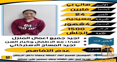 رقم الاعلان | 20946 | القسم | خدمات | التصنيف | عمالة منزلية |