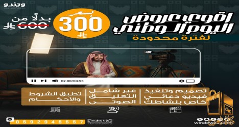 وكالة ويندو للدعاية والإعلان عروض وخصومات اليوم الوطني السعودي 95 - إدارة سوشيال ميديا جميع المنصات (فيسبوك-إنستجرام-سناب شات- تيك توك-لينكد إن-تويتر-يوتيوب) - تصميم مواقع الكترونية ومتاجر تجارية ومواقع سلة - تصاميم جرافيك وفيديوهات دعائية - تصميم بروفايل ومنيو وكتالوج خصومات وعروض لفترة محدودة تواصل معنا الآن: