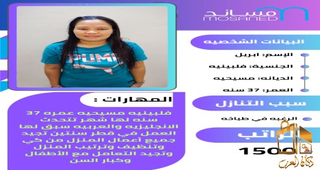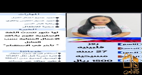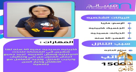 | رقم الاعلان | 20947 | القسم | خدمات | التصنيف | عمالة منزلية |