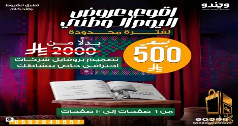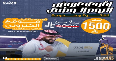 وكالة ويندو للدعاية والإعلان عروض وخصومات اليوم الوطني السعودي 95 - إدارة سوشيال ميديا جميع المنصات (فيسبوك-إنستجرام-سناب شات- تيك توك-لينكد إن-تويتر-يوتيوب) - تصميم مواقع الكترونية ومتاجر تجارية ومواقع سلة - تصاميم جرافيك وفيديوهات دعائية - تصميم بروفايل ومنيو وكتالوج خصومات وعروض لفترة محدودة تواصل معنا الآن: