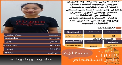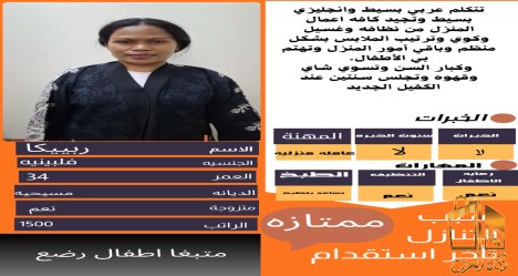 | رقم الاعلان | 21119 | القسم | خدمات | التصنيف | عمالة منزلية |